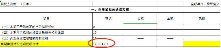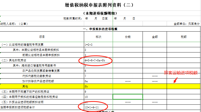 为什么说填到8b栏就能抵扣销项税额呢?因为第12栏=1+4+11,而第4栏=5+6+7+8a+8b,所以,旅客运输服务的进项只有填到第8b栏才能统计到第12栏,才能统计到主表的第12栏“进项税额”抵扣销项税额。做为财税人员,填报增值税申报表时一定注意呦!