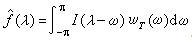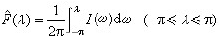 当平稳序列的谱分布函数F(λ)具有谱密度ƒ(λ)(即功率谱)时,可用(2π)-1I(λ)去估计?(λ),它是ƒ(λ)的渐近无偏估计。如欲求ƒ(λ)的相合估计,可用I(ω)的适当的平滑值去估计ƒ(λ),常用的方法为谱窗估计即取ƒ(λ)的估计弮(λ)为 ,式中wt(ω)称为谱窗函数。谱窗估计是实际应用中的重要方法之一。谱分布F(λ)本身的一种相合估计可由I(ω)的积分直接获得,即