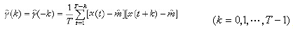 时域分析 它的目的在于确定序列在不同时刻取值的相互依赖关系,或者说,确定序列的相关结构。这种结构是用序列的自相关函0,1,…)来描述的,为序列的自协方差函数值,m=Ex(t)是平稳序列的均值。常常采用下列诸式给出m,γ(k),ρ(k)的估计: