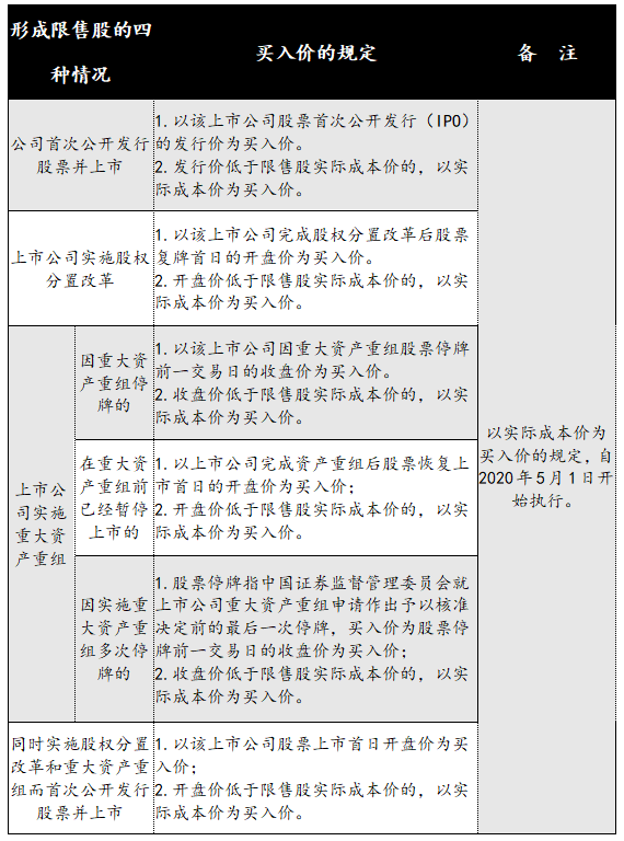 上述四个公告对单位转让禁流通后限售股的买入价的规定,整理如下: