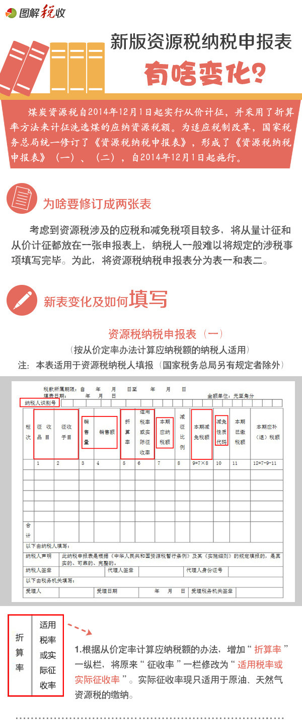 煤炭资源税自今年12月1日起实行从价计征。为适应税制改革,税务总局统一修订了《资源税纳税申报表》,并将其分为表一和表二,并自2014年12月1日起施行。新版申报表有哪些变化?两张表格该如何填写?