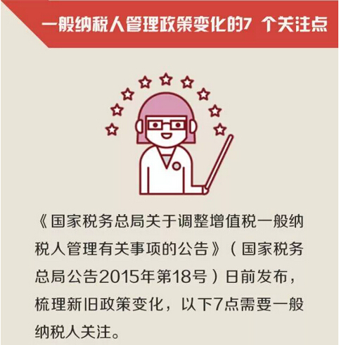 按照《国务院关于取消和调整一批行政审批项目等事项的决定》(国发〔2015〕11号)精神,国家税务总局发布了《国家税务总局关于调整增值税一般纳税人管理有关事项的公告》(2015年第18号,以下简称《公告》)。《公告》对增值税一般纳税人管理有关事项进行了调整。本文在梳理对比新旧政策的基础上,总结了纳税人关于增值税一般纳税人管理政策变化后应注意的七大关注点。
