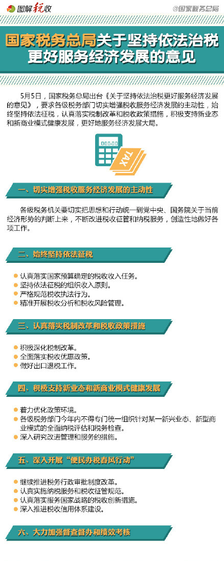 5月5日,税务总局出台《关于坚持依法治税更好服务经济发展的意见》,要求各级税务部门增强服务经济发展主动性,坚持依法征税,认真落实税制改革和税收政策措施,更好服务经济发展大局。《意见》有哪些干货,一图了解↓
