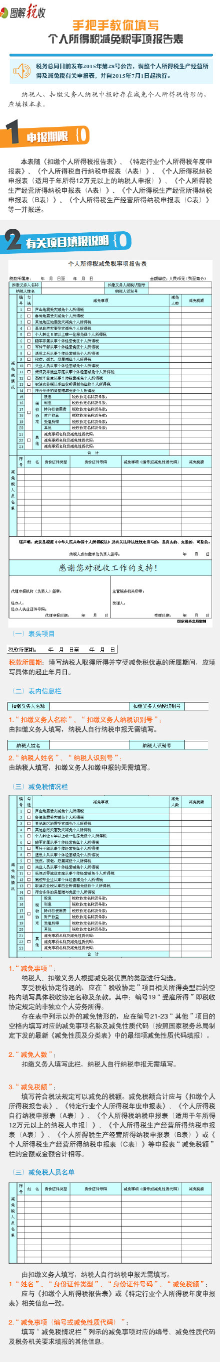 税务总局日前发布2015年第28号公告,发布个人所得税生产经营所得及减免税有关申报表,自2015年7月1日起执行。申报表主要包括个人所得税生产经营所得纳税申报A表、B表、C表及个税减免税事项报告表。以下来学习个税减免税事项报告表↓