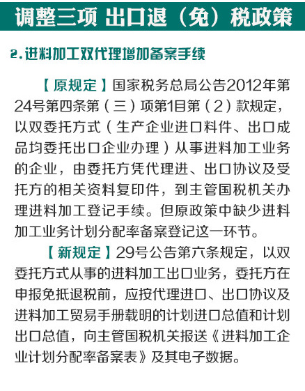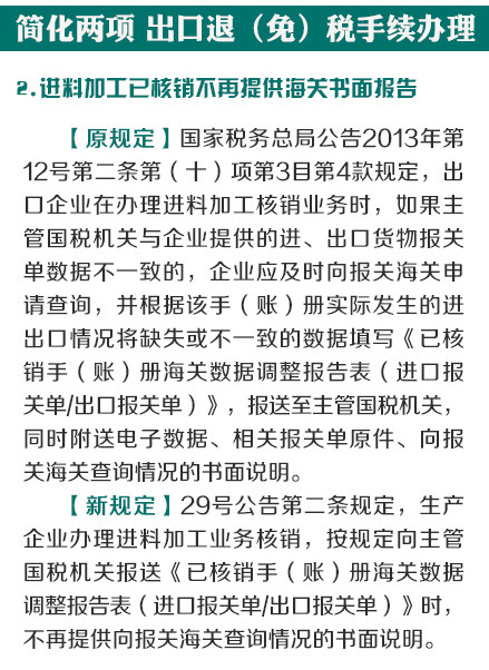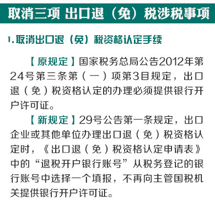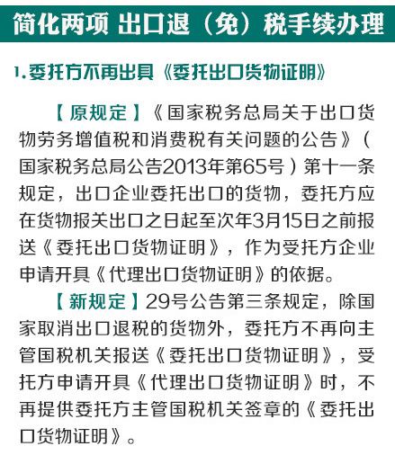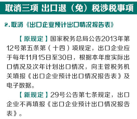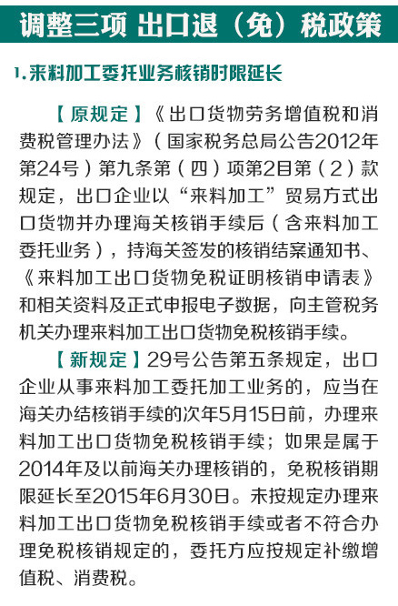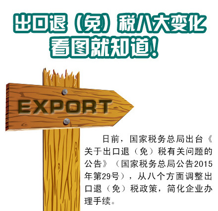 日前,税务总局出台《关于出口退(免)税有关问题的公告》(国家税务总局公告2015年第29号),从八个方面调整出口退(免)税政策,简化企业办理手续。包括:调整三项出口退(免)税政策;取消三项出口退(免)税涉税事项;简化两项 出口退(免)税手续办理↓