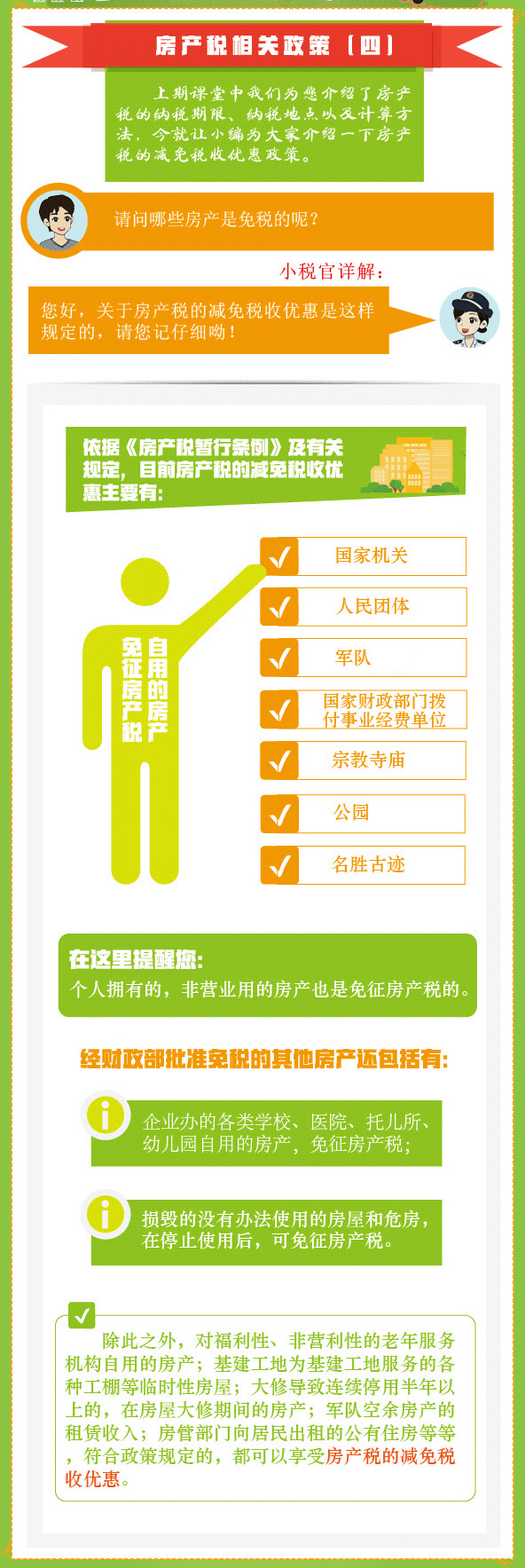 上一期,我们为大家介绍了房产税的纳税期限、纳税地点以及计算方法,今天,就让小编为大家介绍一下房产税的减免税收优惠政策