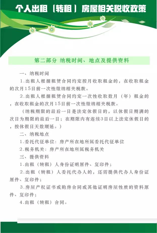 个人出租(转租)房屋相关税收政策(纳税时间、地点及提供资料)