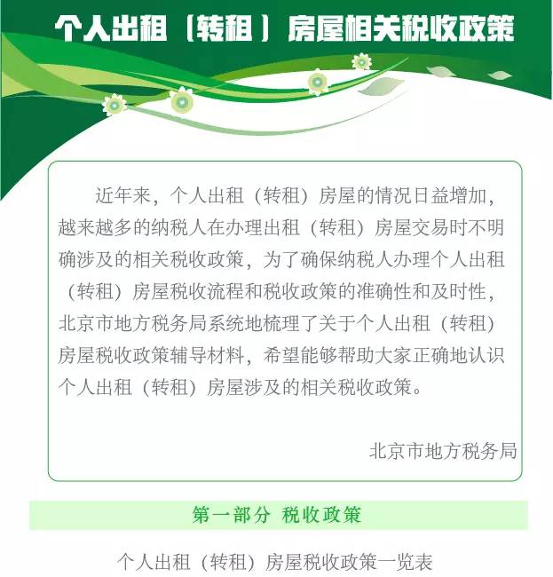 近年来,个人出租(转租)房屋的情况日益增加,越来越多的纳税人在办理出租(转租)房屋交易时不明确涉及的相关税收政策,为了确保纳税人办理个人出租(转租)房屋税收流程和税收政策的准确性和及时性,北京市地方税务局系统地梳理了关于个人出租(转租)房屋税收政策,希望能够帮助大家正确地认识个人出租(转租)房屋涉及的相关税收政策。
