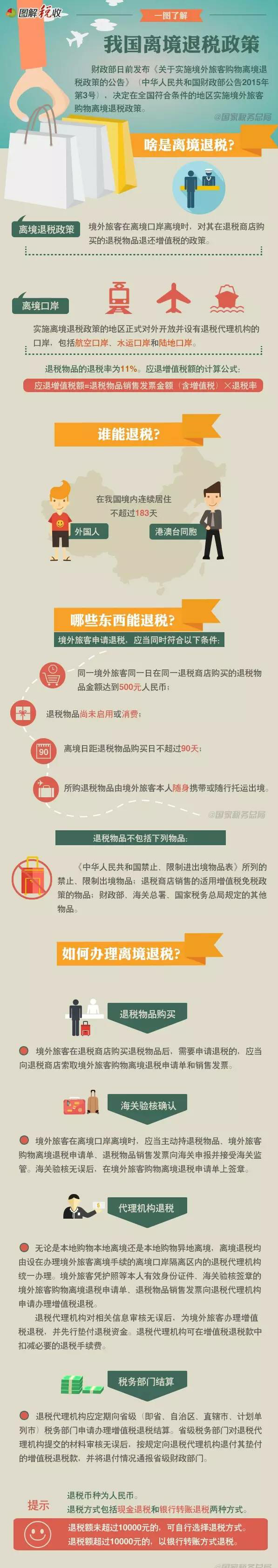 财政部日前发布《关于实施境外旅客购物离境退税政策的公告》(中华人民共和国财政部公告2015年第3号),决定在全国符合条件的地区实施经纬旅客购物离境退税政策。