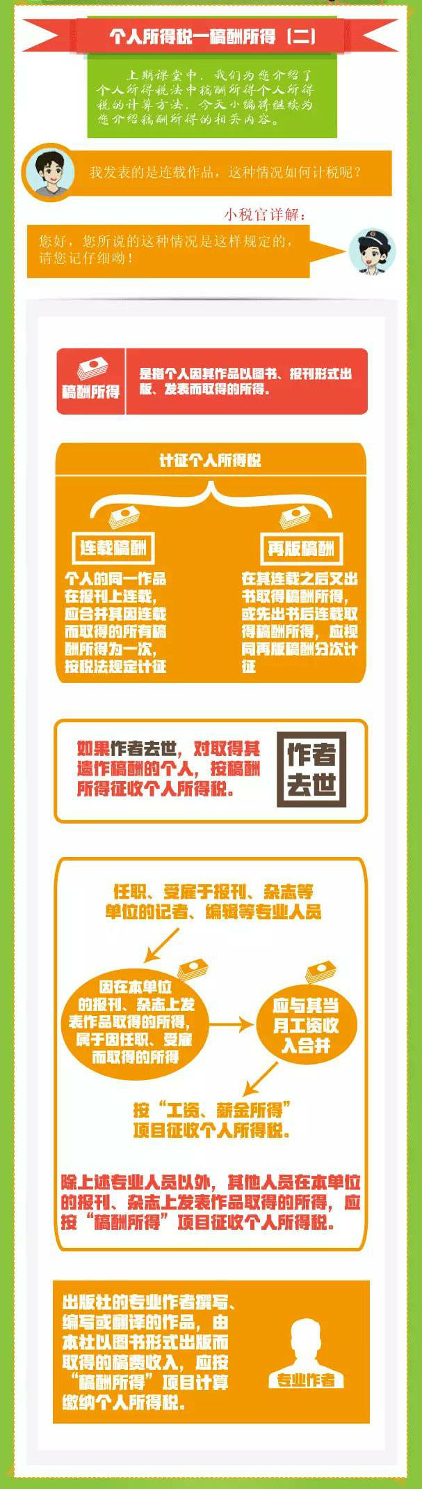 上一期,我们为大家介绍 个人所得税法中稿酬所得个人所得税的计算方法,今天小编将继续为大家介绍稿酬所得的相关内容。