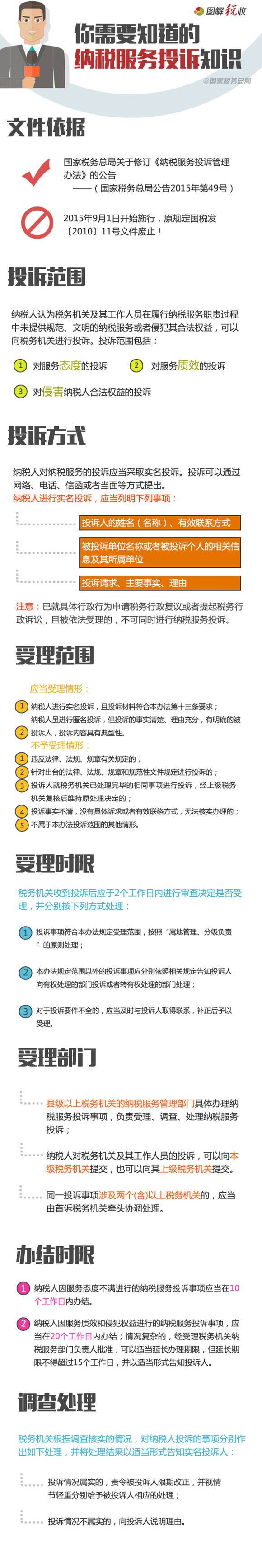 近日,国家税务总局修订并发布《纳税服务投诉管理办法》,压缩了纳税服务投诉的办理时限,税务部门收到投诉后要在2个工作日内受理、20个工作日内办结,纳税人需要填写的投诉文书也由原来的五类简化为一张表格,纳税人进行服务投诉将更便捷、更高效,更能得到及时妥善地处理,自9月1日起正式实施。
