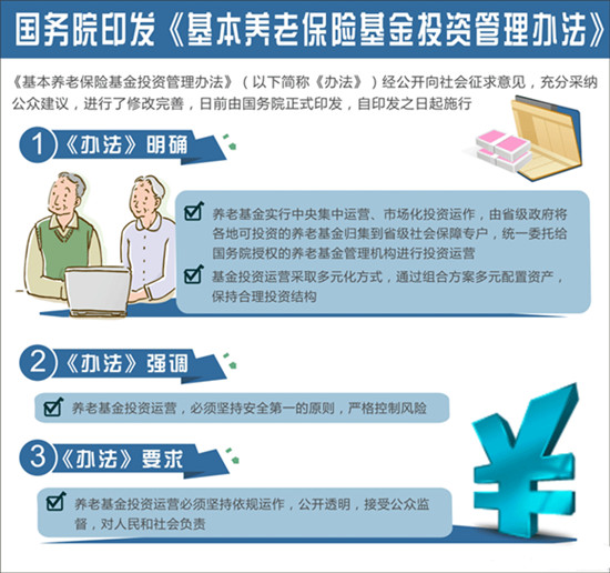 《基本养老保险基金投资管理办法》(以下简称《办法》)经公开向社会征求意见,充分采纳公众建议,进行了修改完善,日前由国务院正式印发,自印发之日起施行。