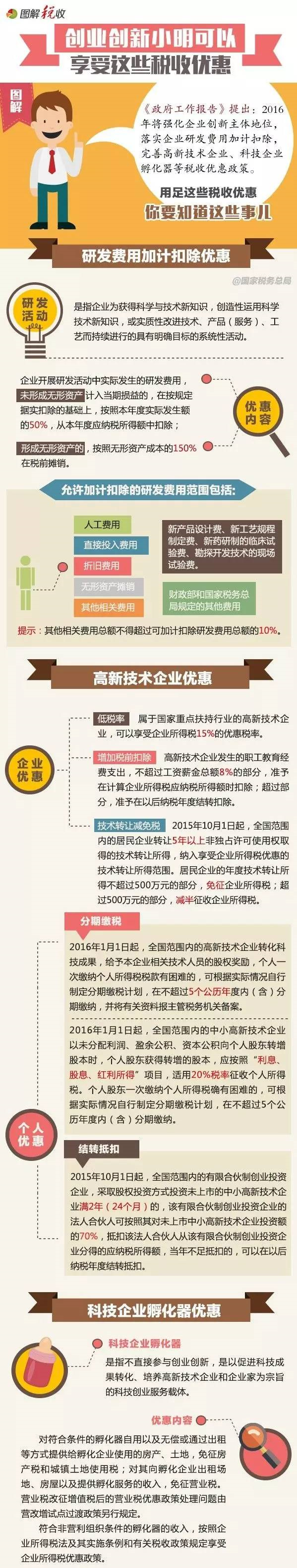 《政府工作报告》提出:2016年将强化企业创新主体地位,落实企业研发费用加计扣除,完善高新技术企业、科技企业孵化器等税收优惠政策。用足这些税收优惠,你要知道这些事儿。