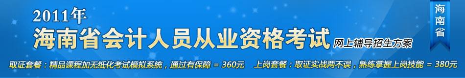 网校总结历年成功辅导经验,结合海南地区会计从业的命题规律、重点、难点,融入先进的教学理念, 大胆创新,推出2011年会计从业考试取证套餐、上岗套餐个性化辅导。学员自付费之日起可享受长达六个月的学习期(实务操作课程学习期限为三个月),机会难得,欲报从速!