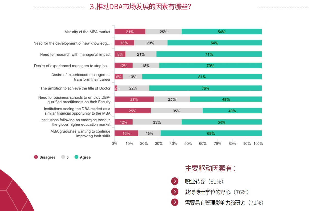 在调查受访者中,81%的人表示学习DBA的主要动机是职业转型,76%的人表示希望获得博士头衔,另外71%的人则认为需要进行具有管理影响的研究。