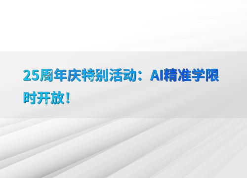 参加25周年庆活动有哪些具体福利?答:活动期间,学员不仅可以享受AI精准学的限时免费使用,还能参与抽奖赢取立牌套装、黄金三件套、卡西欧手表等豪华礼品。购买特定课程还可获得25周年校庆礼盒,以及享受24期免息分期付款的优惠。