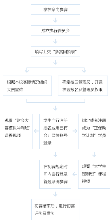 完成学校报名的院校可组织学生进行在线注册报名,通过登录正保会计网校(www.fawtography.com)点击“校园频道”选择“校园大赛”进入大赛官网在线注册,或关注“财会学姐”微信公众账号,下载“正保会计网校”APP,进入APP点击“校园大赛”,进入大赛页面,自行注册。已有正保会计网校账户(初次登录补充学校及参赛信息)后参赛。