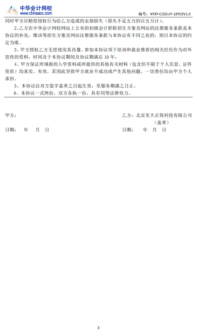 初级会计职称定制上岗班学员服务协议