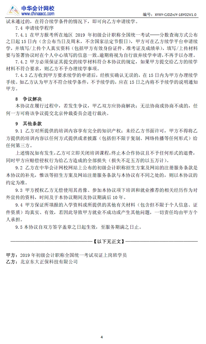 初级会计职称双证上岗班协议书