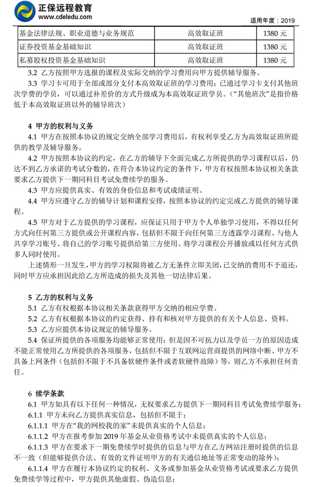 2019年基金从业资格高效取证班协议书