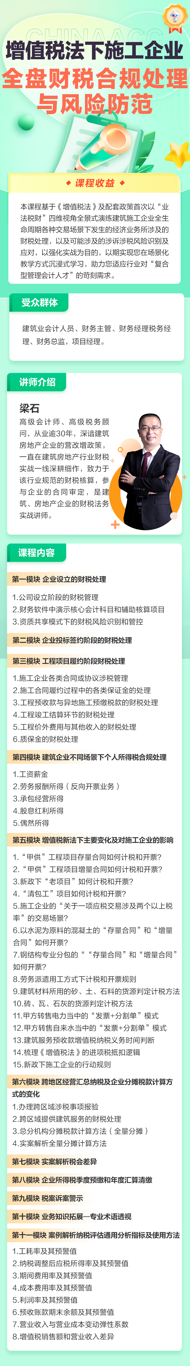 选课中心首页 > 建筑施工 > 增值税法下施工企业全盘财税合规处理与风险防范