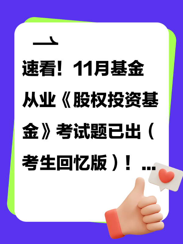 2025年11月基金从业统一考试结束!小保给大家整理了部分本次考试《股权投资基金》的试题(考生回忆版)供大家参考!其它科目试题(考生回忆版):速看!11月基金从业《基金基础知识》考试题已出(考生回忆版)!速看!11月基金从业《证券...