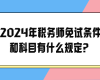 在税务师报名阶段符合相关高级专业技术职务,从事涉税工作满两年可以申请免试财会或法律科目,而在补报名期间,同样可以申请免试,补报名免试申请要求和报名期免试申请要求是一样的。2024年税务师免试条件和科目规定符合报名条件,并具备...