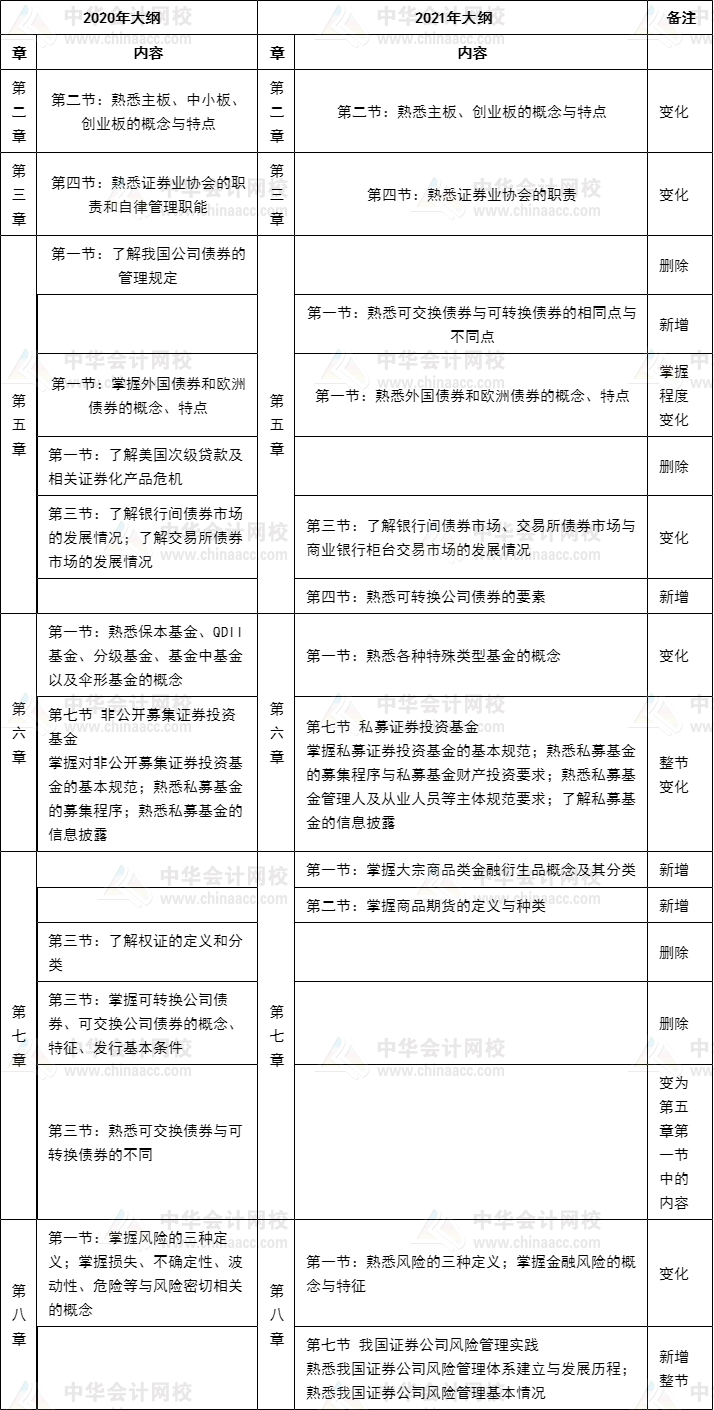 准备参加证券从业资格考试的小伙伴们大家好,为促进证券从业人员提升执业品行和专业能力,适应资本市场发展的新形势、新要求,中国证券业协会发布《证券业从业人员一般从业资格考试大纲(2021)》的公告,网校针对大纲内容进行了对比,从大纲变动来看,整体变动不是很大,变动率约为5%左右。其中第六章第七节整节变动,第八章新增第七节,另外第五章和第七章变动较大,那么接下来我们来详细看一看每章的详细变动。