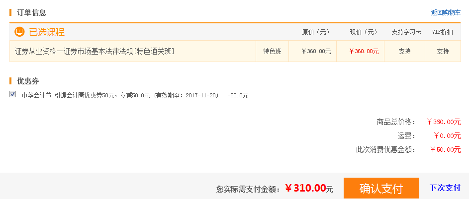注:以上优惠券可在2017年11月20日24:00前用于购买正保会计网校任意课程、班次升级、转赠好友;每个订单限使用一张优惠券;可与VIP同时享用;继续教育、单班次、教材及辅导书除外。