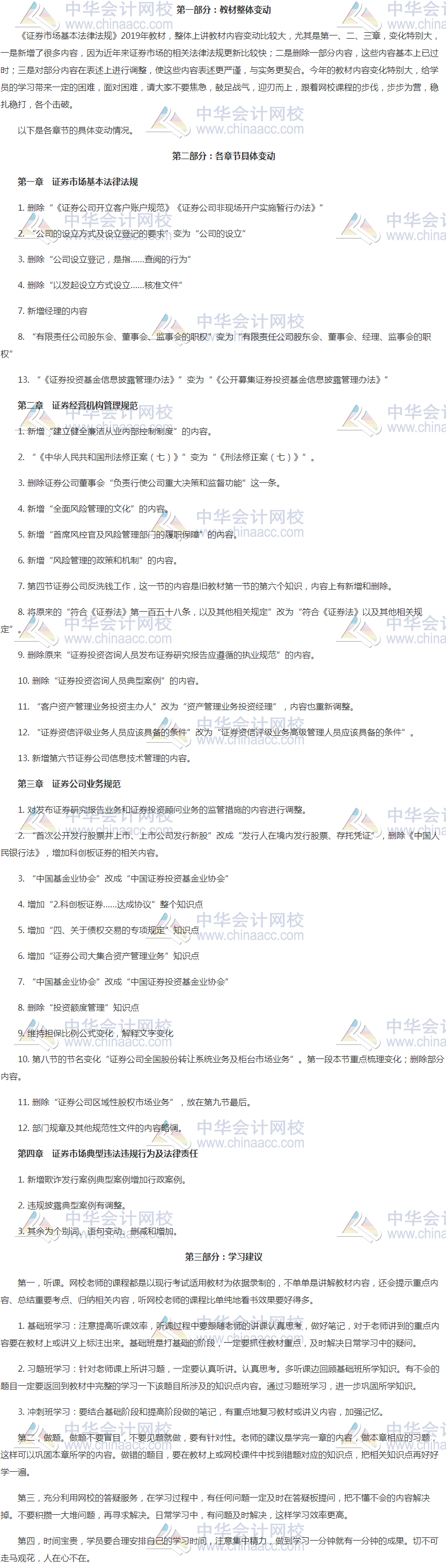 证券从业2019版新教材已经拿到手中了吗?还没有购买教材的考生要抓紧了(教材基本信息>>)。拿到教材后要怎么学习,怎么看教材,《证券市场法律法规》各章节变化详情,了解一下。