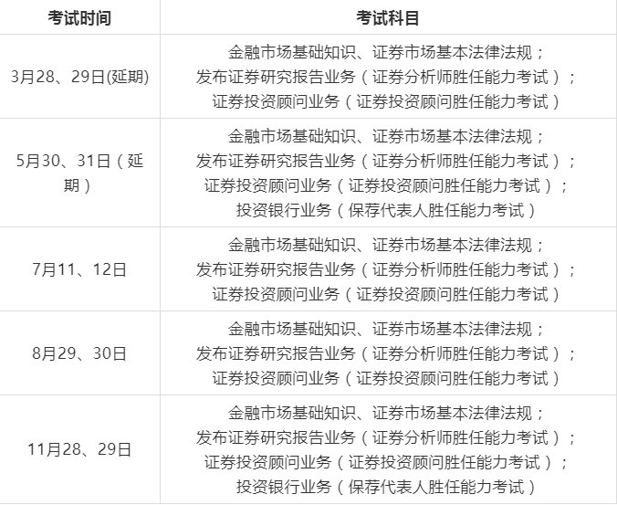 根据《中国证券业协会2020年度考试计划》,2020年证券从业资格考试科目如下: