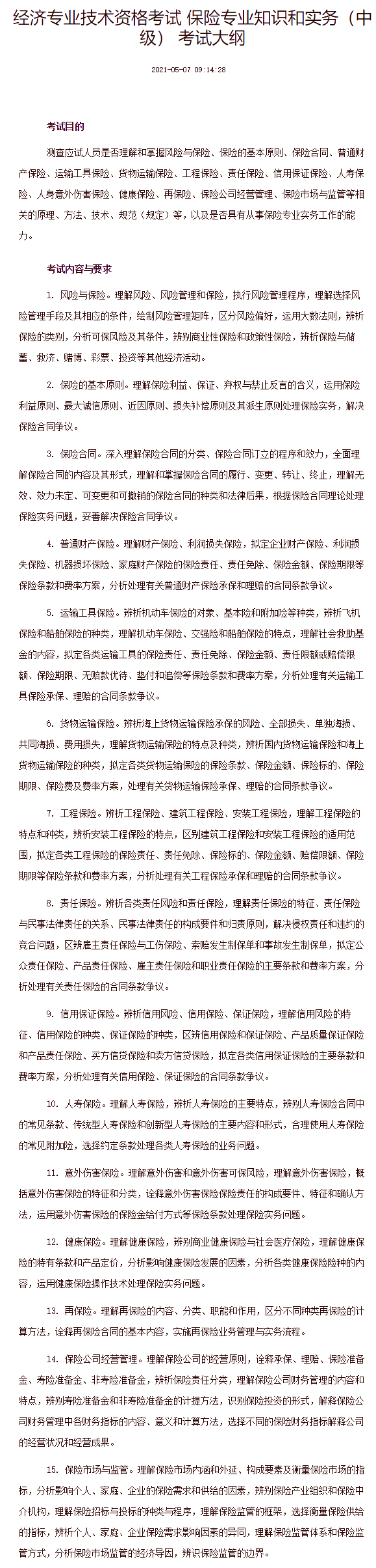 2021年中级经济师《保险专业知识与实务》考试大纲已经公布,相信不少考生都想了解,正保会计网校的小编为大家整理了相关内容,保险专业的中级经济师考生们快来看看吧~
