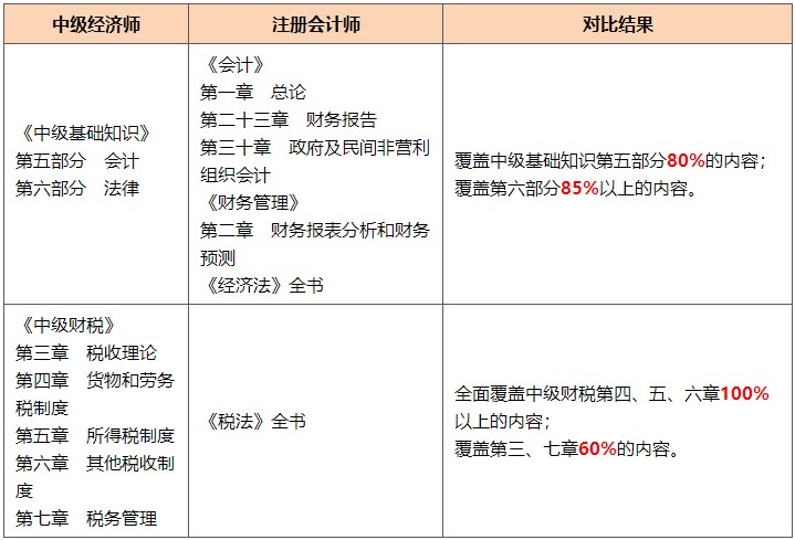 从对比来看:注册会计师《会计》、《财务管理》、《经济法》与中级经济师《经济基础知识》关系比较密切,可覆盖中级基础知识第五部分80%的内容;覆盖第六部分85%以上的内容。而注册会计师《税法》科目全面覆盖中级财税第四、五、六章100%以上的内容;覆盖第三、七章60%的内容。