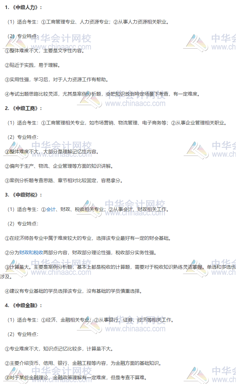 中级经济师考试工商管理、财政税收、金融、人力资源管理这四个专业《经济基础知识》是必考的,主要就是专业课不同,考试侧重点是不同的,这四个专业的报考人数最多,中级财税难度最大,中级金融、中级工商、中级人力难度持平,相对来说简单一些。具体哪个专业比较好考,主要是看个人情况的。下面是这个四个专业的特点及适合报考考生。