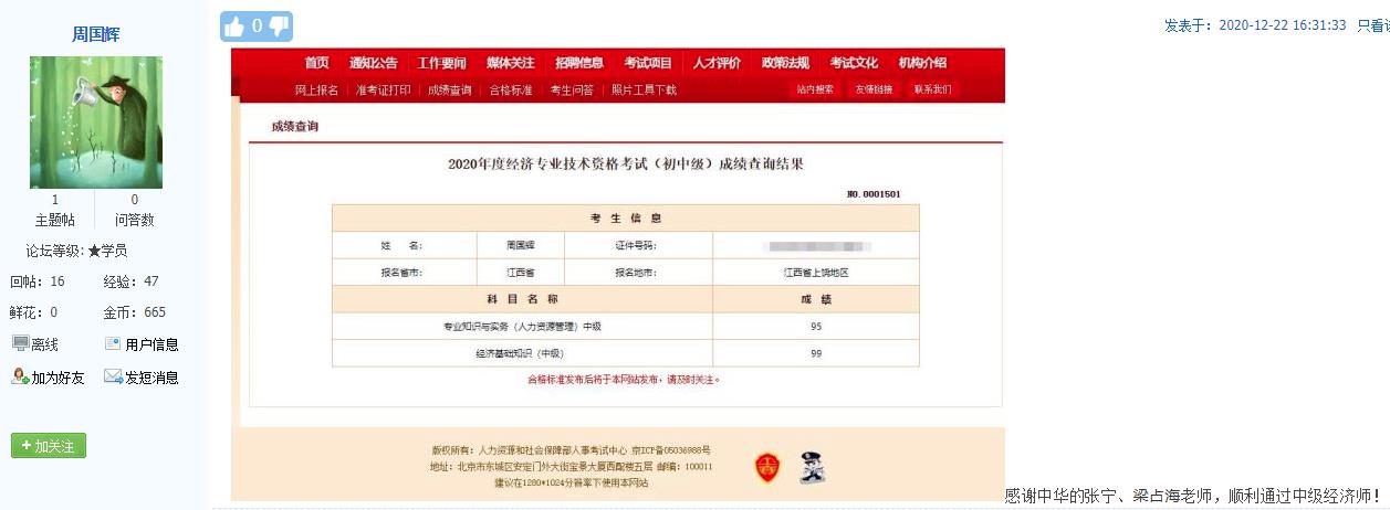 2020年初/中级经济师考试成绩已公布,快去查分>>网校中级经济师学员喜报频传,这位学员中级经济师人力95分,基础99分,感谢正保会计网校的张宁、梁占海老师,顺利通过中级经济师!