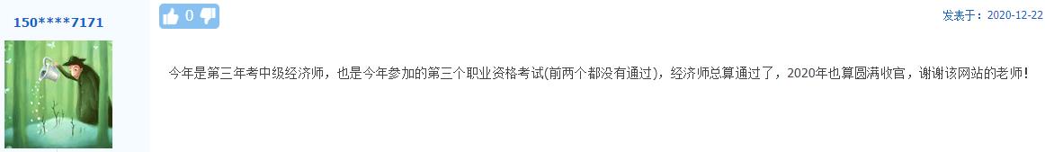 2020年初/中级经济师考试成绩已公布,快去查分>>,网校喜报频传,中级经济师学员150****7171说:今年是第三年考中级经济师,也是今年参加的第三个职业资格考试(前两个都没有通过),经济师总算通过了,2020年也算圆满收官,谢谢该网站的老师!