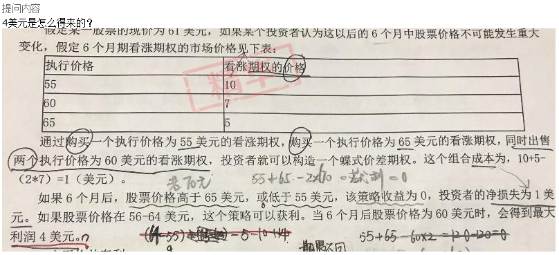 如果股票价格在56~64美元,这个策略可以获利。当6个月后股票价格为60美元时,会得到最大利润4美元。计算公式为: