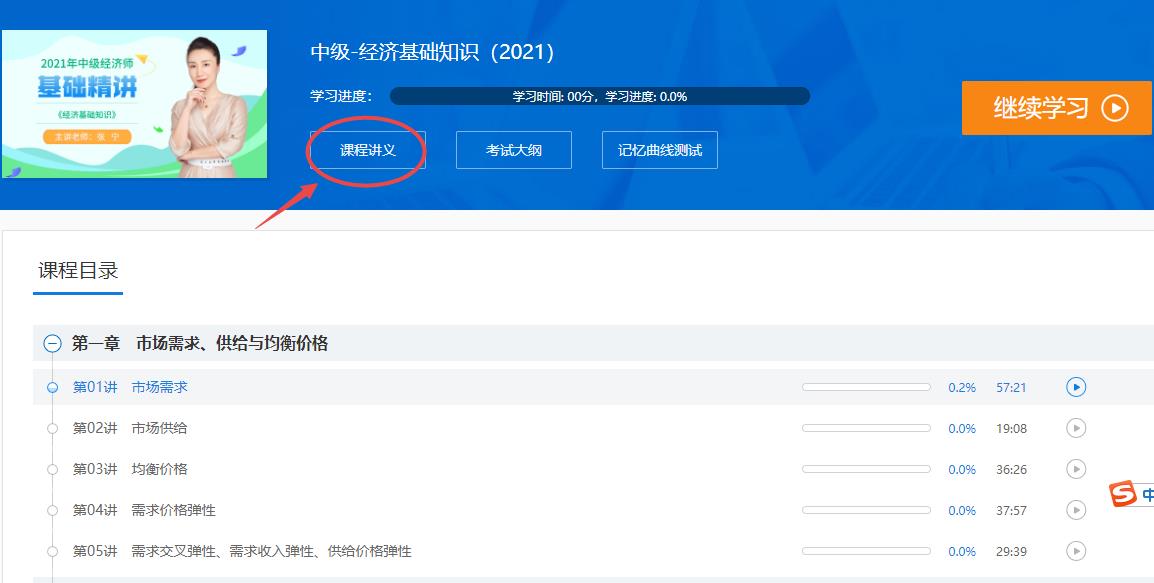 网校中级经济师课程均含有配套讲义,在听完老师的课件后,还可通过查看讲义的方式,来回顾、记忆知识点。以下是电脑端查看讲义的方法: