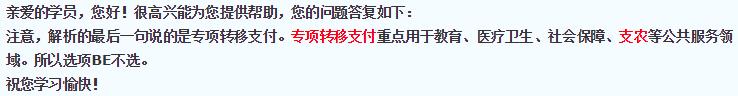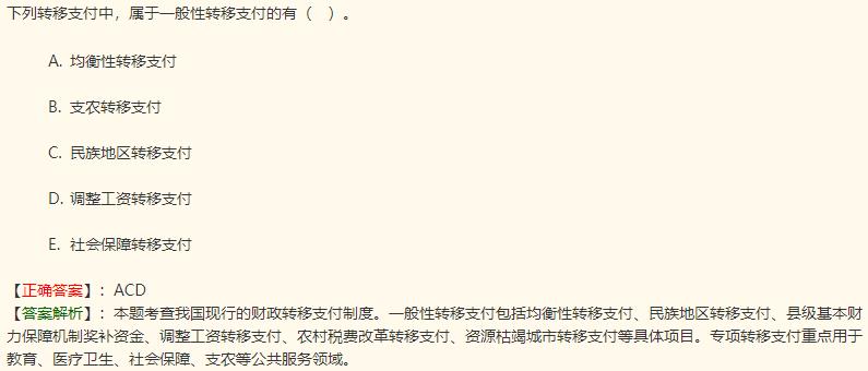 本题考查我国现行的财政转移支付制度。一般性转移支付包括“支农”等公共服务领域,但为什么答案B、支农转移支付又错了呢?