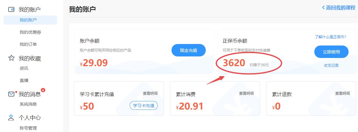 购买课程:每份订单实际支付金额即是获得正保币的数额,如消费500元即获得500个正保币。