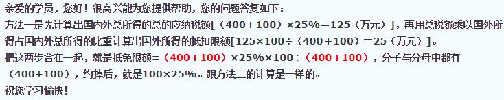 想问境外所得扣除限额=125×100÷(400+100)=25(万元)怎么理解,没看明白。感觉境外所得扣除限额=100*0.25=25万元这样计算。