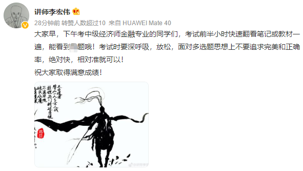 网校中级经济师李宏伟老师提醒广大考生:下午考中级经济师金融专业的同学们,考试前半小时快速翻看笔记或教材一遍,能加深记忆!考试时要深呼吸,放松,面对多选题思想上不要追求完美和正确率,绝对快,相对准就可以!祝大家取得满意成绩!