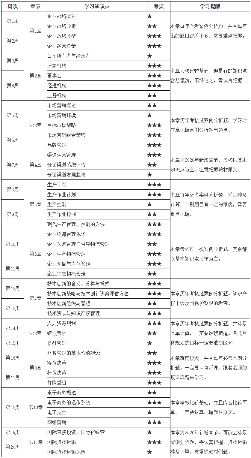 备注:整体进度说明:本计划表共计20周;学员可根据本表的提示,结合自己的时间安排及学习情况进行细化,并按课程要求完成听课、做题的学习任务。