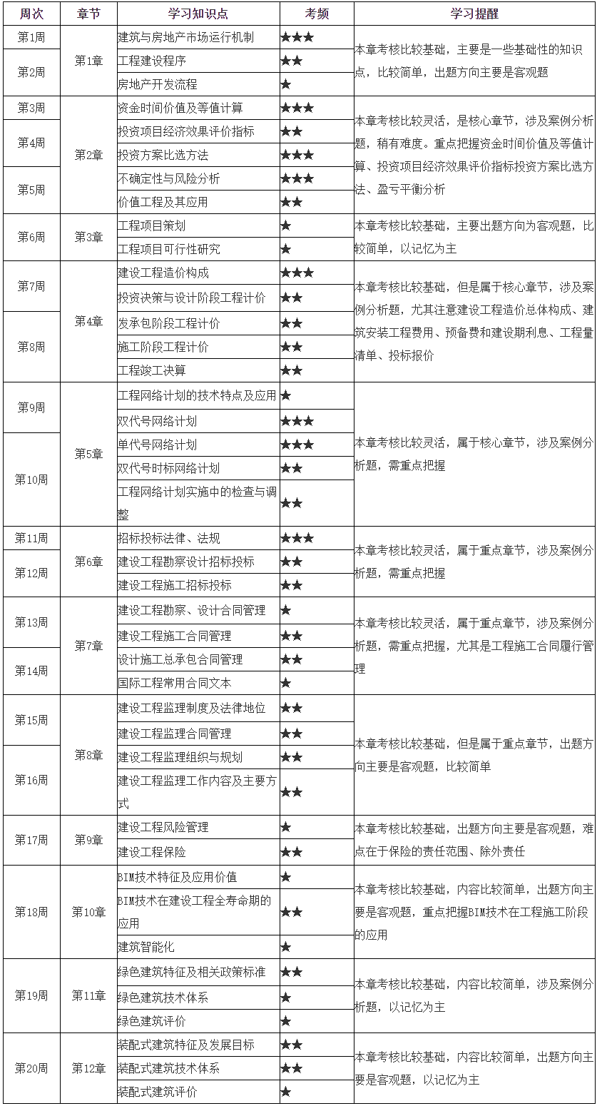2022年中级经济师《建筑与房地产》20周预习计划表