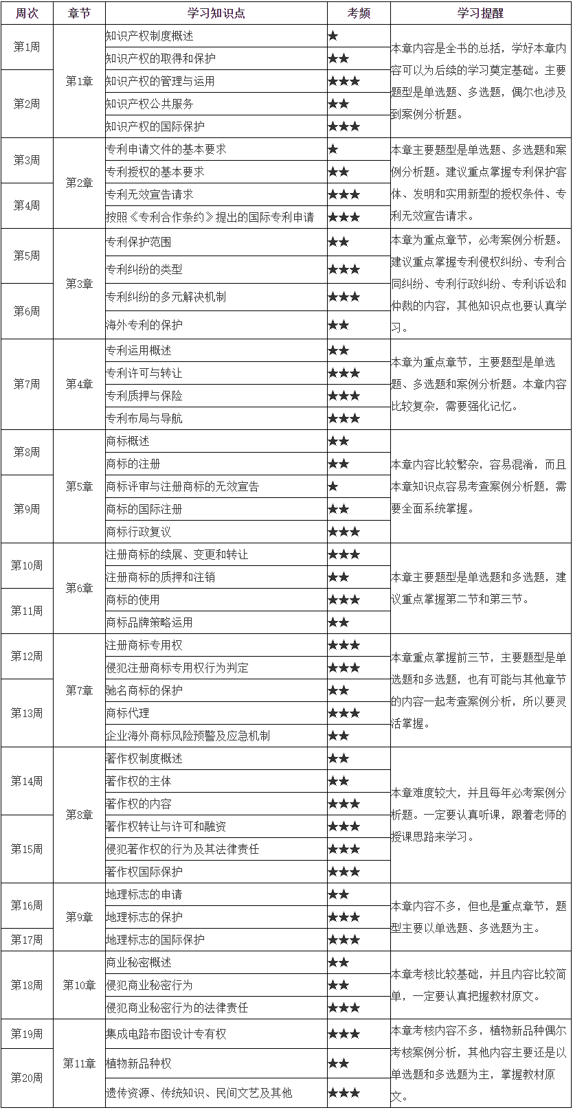备注:整体进度说明:本计划表共计20周;学员可根据本表的提示,结合自己的时间安排及学习情况进行细化,并按课程要求完成听课、做题的学习任务。