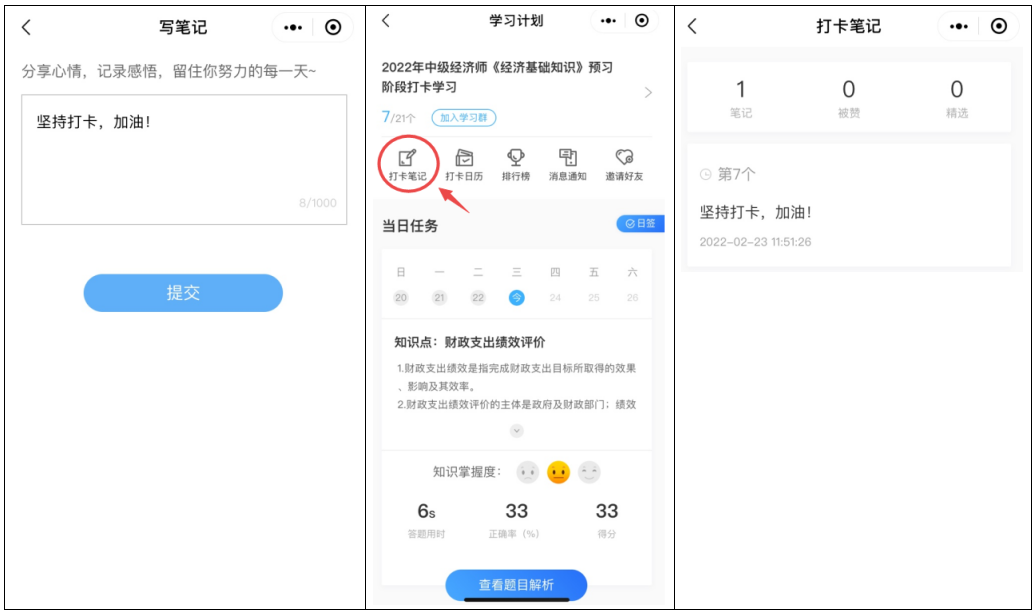 2、记录打卡笔记,分享每日打卡心情!学习过程中难免出现负面小情绪,或想分享学习收获,都可以点“记录笔记”,在留言板上记录自己的情绪、收获,还能查看、点赞、评论他人的打卡笔记,抱团学习更有动力!
