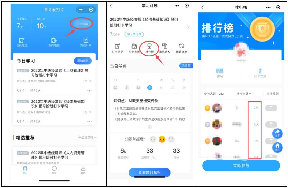 3、设置打卡提醒,坚持每天完成知识点的学习!查看排行榜,看看大家的排名,督促自己持久、长效的参与学习打卡。