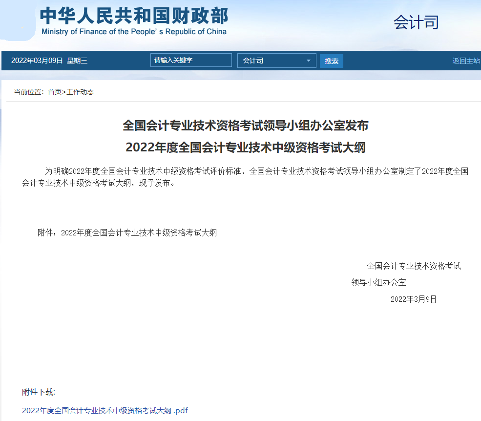 3月9日,就在刚刚,中华人民共和国财政部发布“2022年度全国会计专业技术中级资格考试大纲”,如下图:
