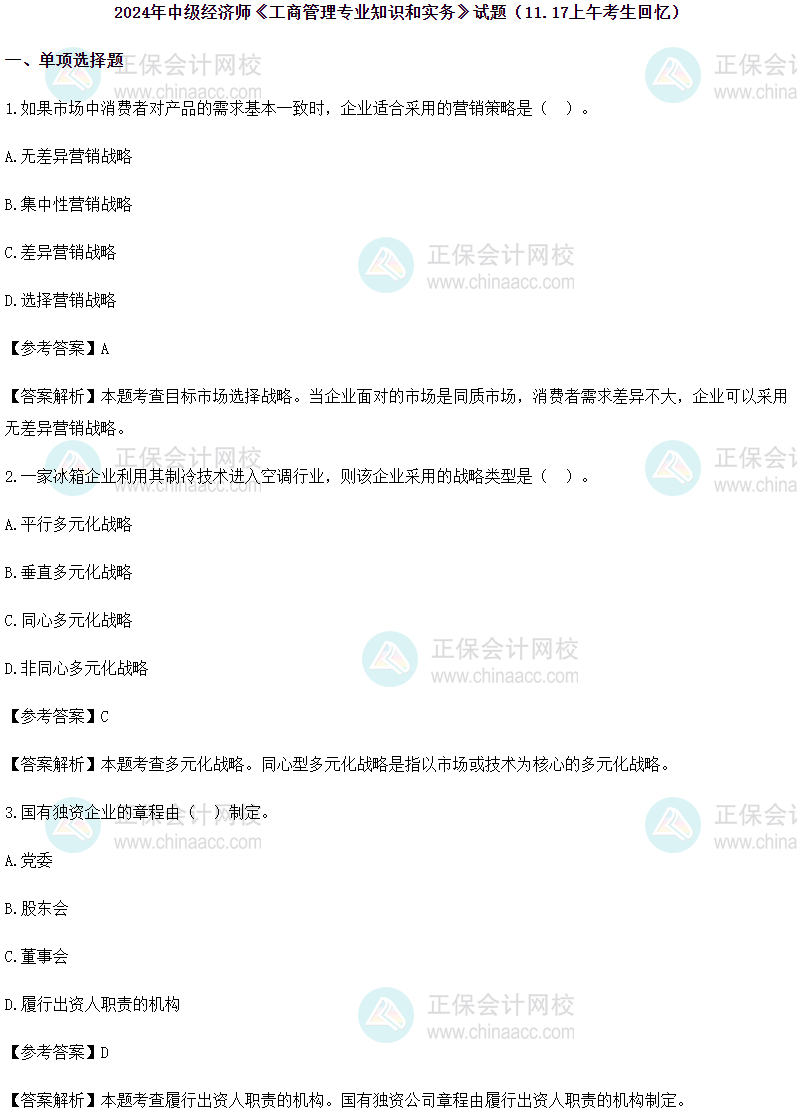 2024年中级经济师《工商管理》考试结束了,都考了哪些试题?正保会计网校根据学员反馈,整理了2024年中级经济师《工商管理》第一批次试题及参考答案(考生回忆版),赶快查看估分吧!