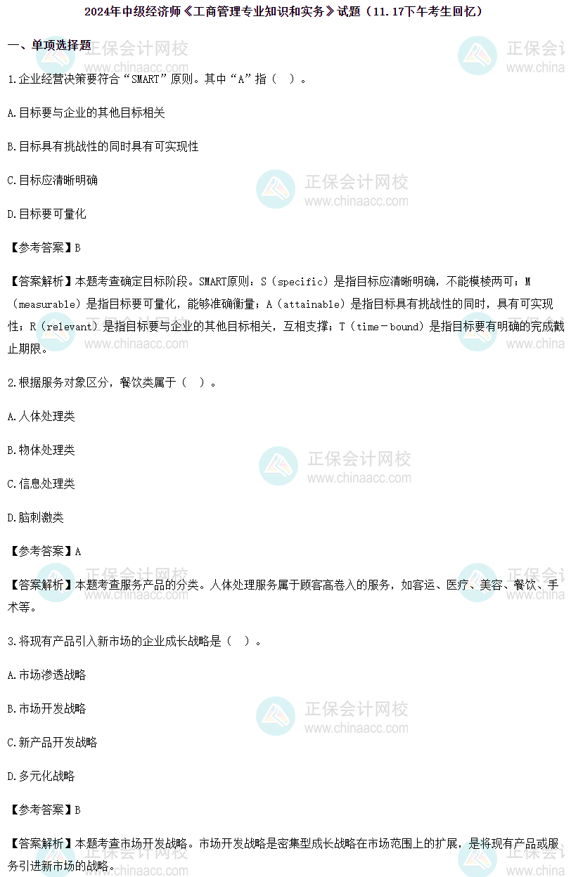 2024年中级经济师《工商管理》考试圆满结束,正保会计网校根据学员反馈,整理了2024年中级经济师《工商管理》第二批次试题及参考答案(考生回忆版),快来估分吧!
